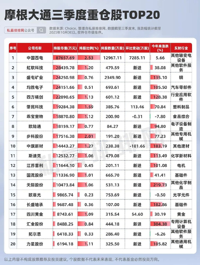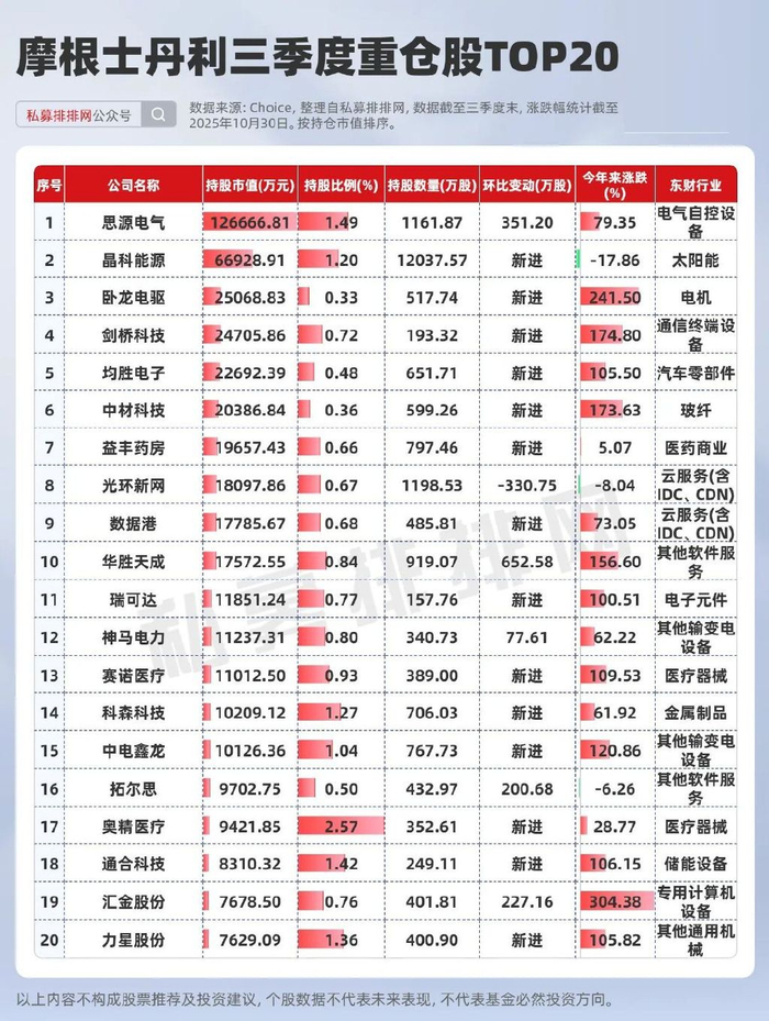 摩根士丹利的最新持仓中,今年来涨幅位居前10的个股分别是:北方长龙(360.29%)、时空科技(341.75%)、汇金股份(304.38%)、卧龙电驱(241.50%)、创新医疗(214.32%)、国光连锁(199.06%)、杭州高新(186.90%)、剑桥科技(174.80%)、中材科技(173.63%)等。