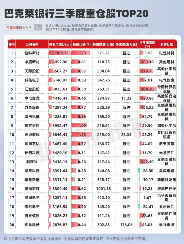 巴克莱银行三季度持有市值最高的是铂科新材,最新持股数量为371.21万股,持有市值约为3.13亿元,占公司流通股比例的1.28%,位居第6大流通股东,公司今年来涨幅高达53.95%。此外,第二、第三大重仓股分别为中旗新材、天际股份,巴克莱银行三季度分别持有114.75万股、334.04万股,持有市值分别为6952.90万元、6587.27万元。