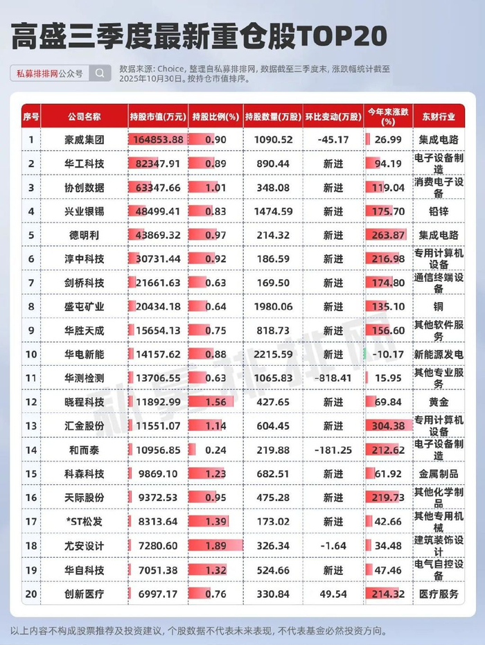 高盛三季度持股市值在1亿元以上个股有14只,持股市值位居前三的分别是豪威集团、华工科技、协创数据。其中,第一大重仓股依旧是豪威集团,最新持股数量为1090.52万股,位列公司十大流通股东第7位,持有的流通市值约为16.49亿人民币,公司今年以来涨幅为26.99%。