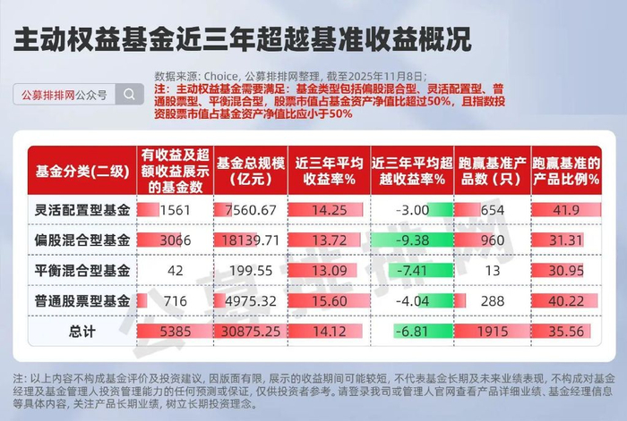 公募排排网数据显示,截至2025年11月8日,在近三年的区间内,全市场有超额收益率和收益率展示的主动权益基金共有5385只,跑赢基准收益的基金数量为1915只,占比为35.56%。