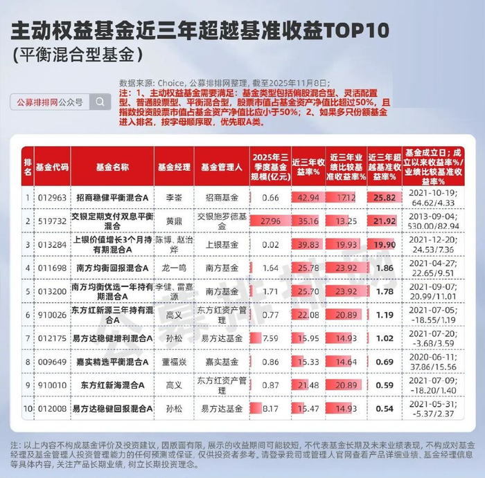 在平衡混合型基金中,近三年超越基准收益率10强基金的“上榜门槛”为0.54%。从管理人角度看,南方基金、易方达基金均有2只产品上榜。收益位列前3的是招商基金李崟、交银施罗德基金黄鼎、上银基金陈博和赵治烨管理的基金。