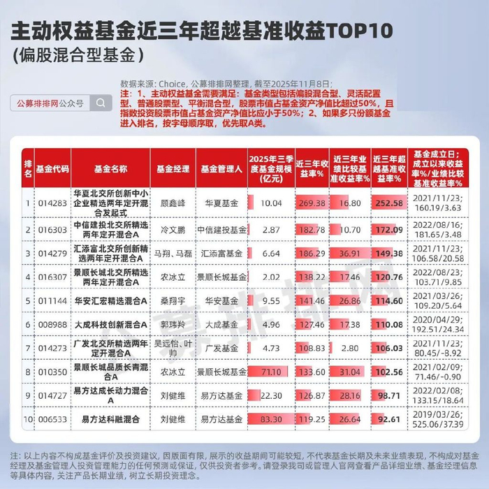 在偏股混合型基金中,近三年超越基准收益率10强基金的“上榜门槛”为92.61%。从管理人角度看,易方达基金、景顺长城基金均有2只产品上榜。收益位列前3的是华夏基金顾鑫峰、中信建投基金冷文鹏、汇添富基金马翔和马磊管理的基金。