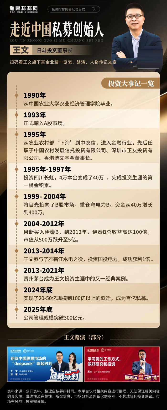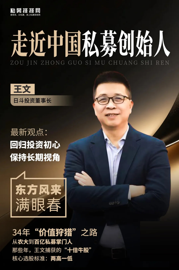 在这条波澜壮阔的征途上,有一批先行者。为记录这些在中国私募行业留下印记的创始人,梳理他们的成长轨迹,解读他们的投资哲学,呈现他们的思考与洞见。私募排排网全新推出《#走近中国私募创始人#》专栏。本期嘉宾——百亿私募日斗投资创始人王文。