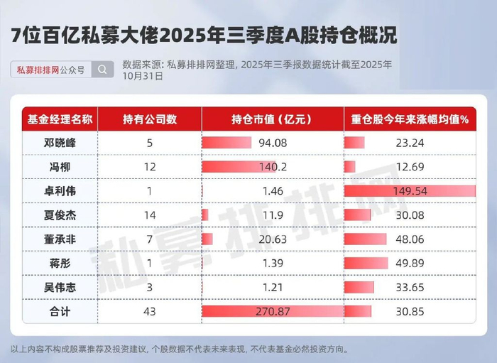 截至2025年三季度末,7位私募大佬旗下产品合计持有43家A股公司,持股市值合计约为270.87亿元,今年前三季度涨幅平均为30.85%。其中,持股公司数在5家以上的有邓晓峰、冯柳、夏俊杰、董承非。持股市值超100亿元的仅有冯柳1人。