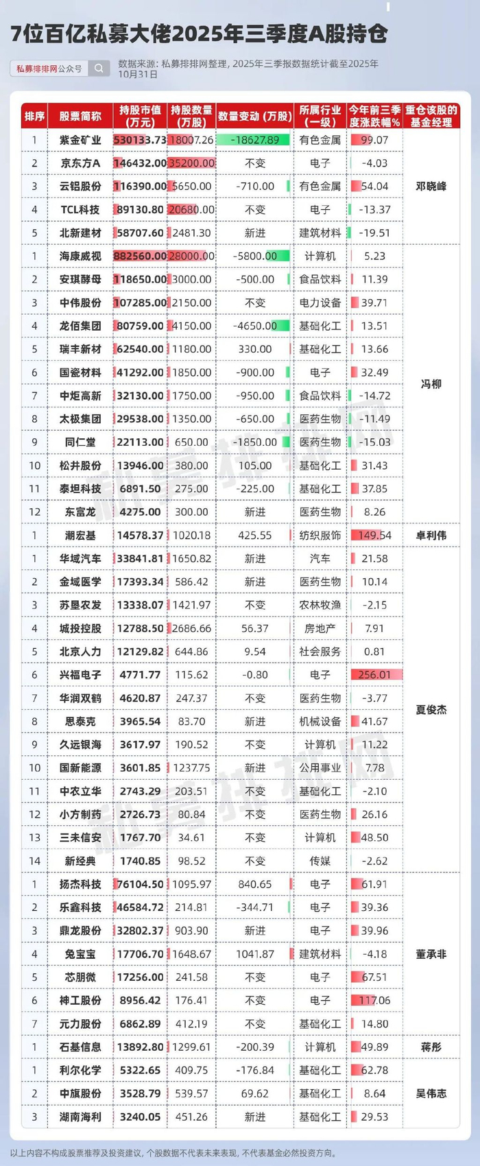 截至2025年10月31日,A股公司2025年三季度报披露基本进入尾声,多位知名百亿私募基金经理也现身在A股的前十大流通股东当中。