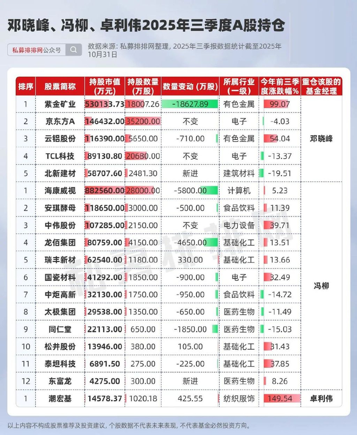 值得注意的是,邓晓峰三季度新进北新建材,合计持有2481.2万股。邓晓峰在三季度的月度报告中写道:从自下而上的角度增加了部分科技硬件公司的持仓,以及个别位于景气周期底部的化工、地产、建材、养殖等行业持仓。