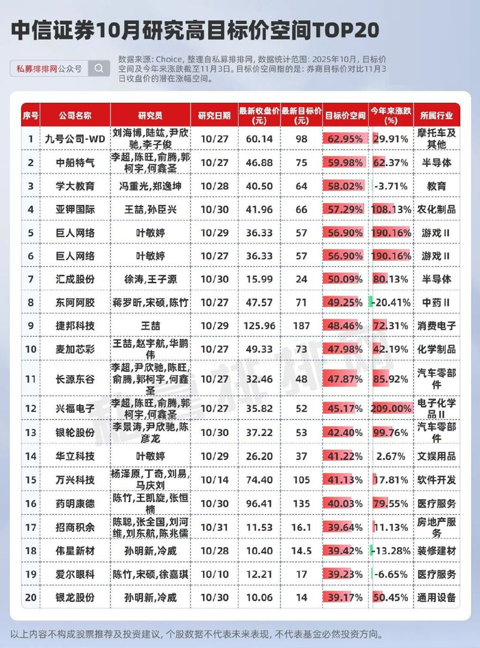 此外,中信证券10月份覆盖的196家上市公司中,目标价空间最高的三只个股分别是九号公司-WD、中船特气、学大教育。其中九号公司-WD被给予98元目标价,目标价空间高达62.95%。