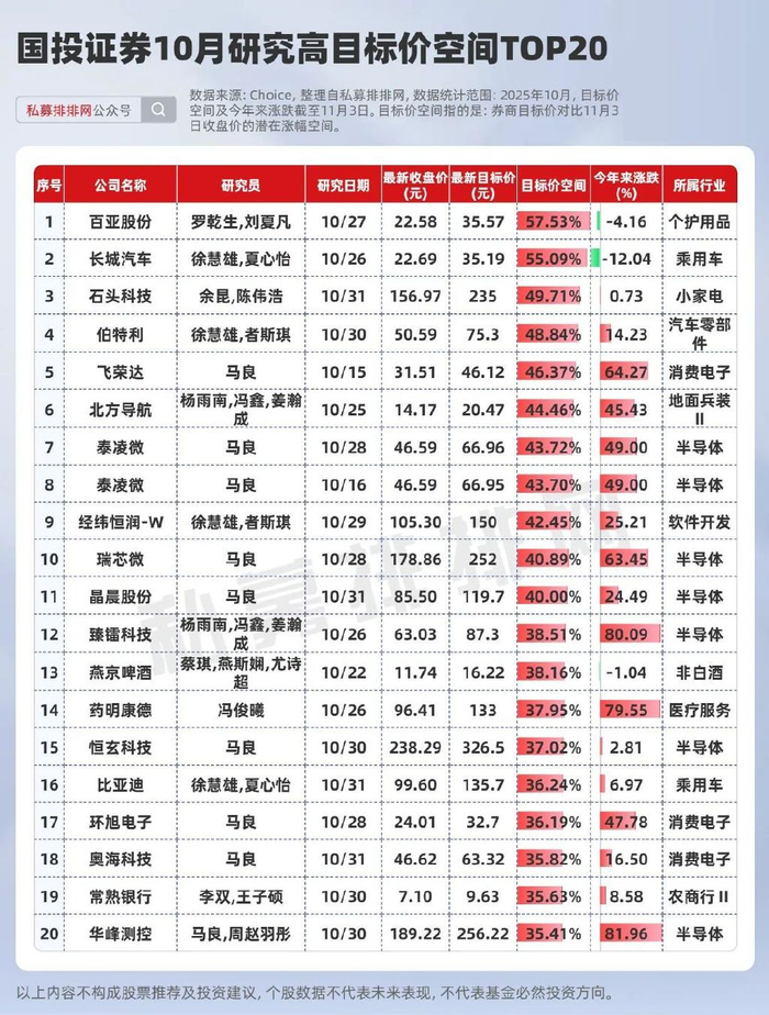 Choice数据显示,10月份国投证券对A股108家上市公司给予研究覆盖,整体研究方向更侧重于汽车零部件、半导体、医疗器械,其中目标价空间在50%以上的个股有2只。目标价空间位居前三的分别是:百亚股份、长城汽车、石头科技。