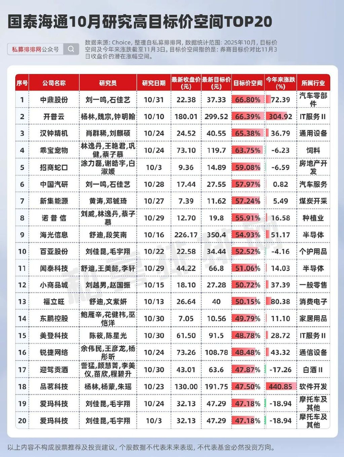 本次将对十月份券商研报中的核心观点与目标价变动进行一次系统性的梳理与盘点。通过聚焦那些被重点覆盖、目标价发生显著调整的上市公司,挖掘券商共识所指向的“价值洼地”究竟在何处?哪些公司被给予了显著的股价上行空间?