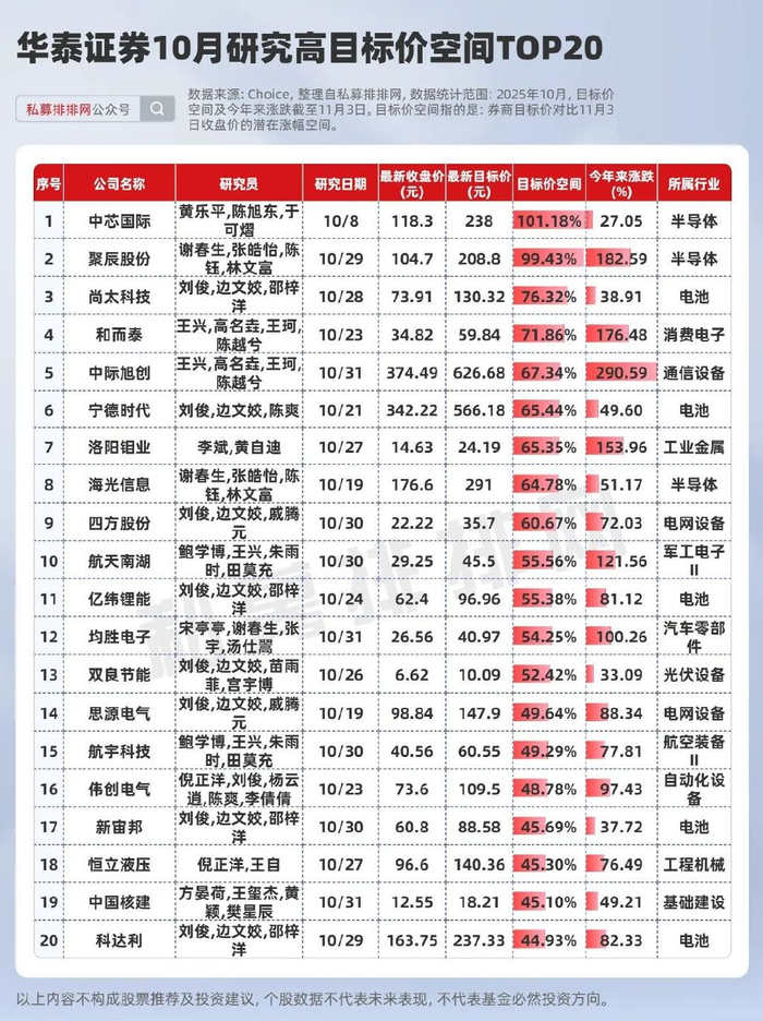 Choice数据显示,10月份华泰证券对A股434家上市公司给予研究覆盖,其中目标价空间在50%以上的个股有13只,且多为科技股。目标价空间位居前三的分别是:中芯国际、聚辰股份、尚太科技。