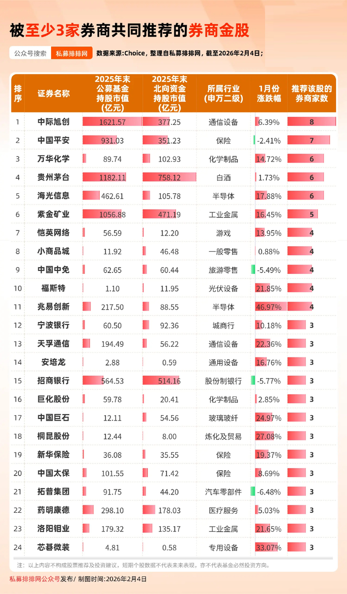 其中,有色金属行业龙头公司紫金矿业,在2025年末,被公募基金持股超1056亿元、北向资金持股超471亿元,该股在1月涨幅超16%。光大证券、华龙证券、华泰证券、天风证券、中国银河等5家券商将该股纳入了2月的金股组合。