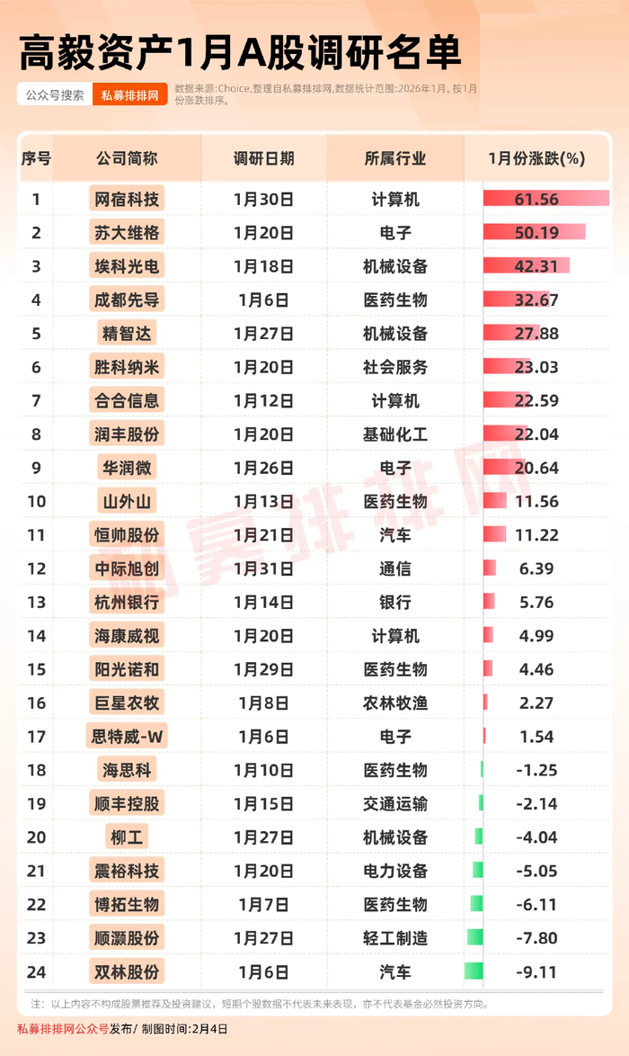 根据私募排排网整理,高毅资产1月份A股共调研了24家公司,调研股1月份平均涨幅为13.15%。股价涨幅位居前三的分别是:网宿科技(61.56%)、苏大维格(50.19%)、埃科光电(42.31%)。