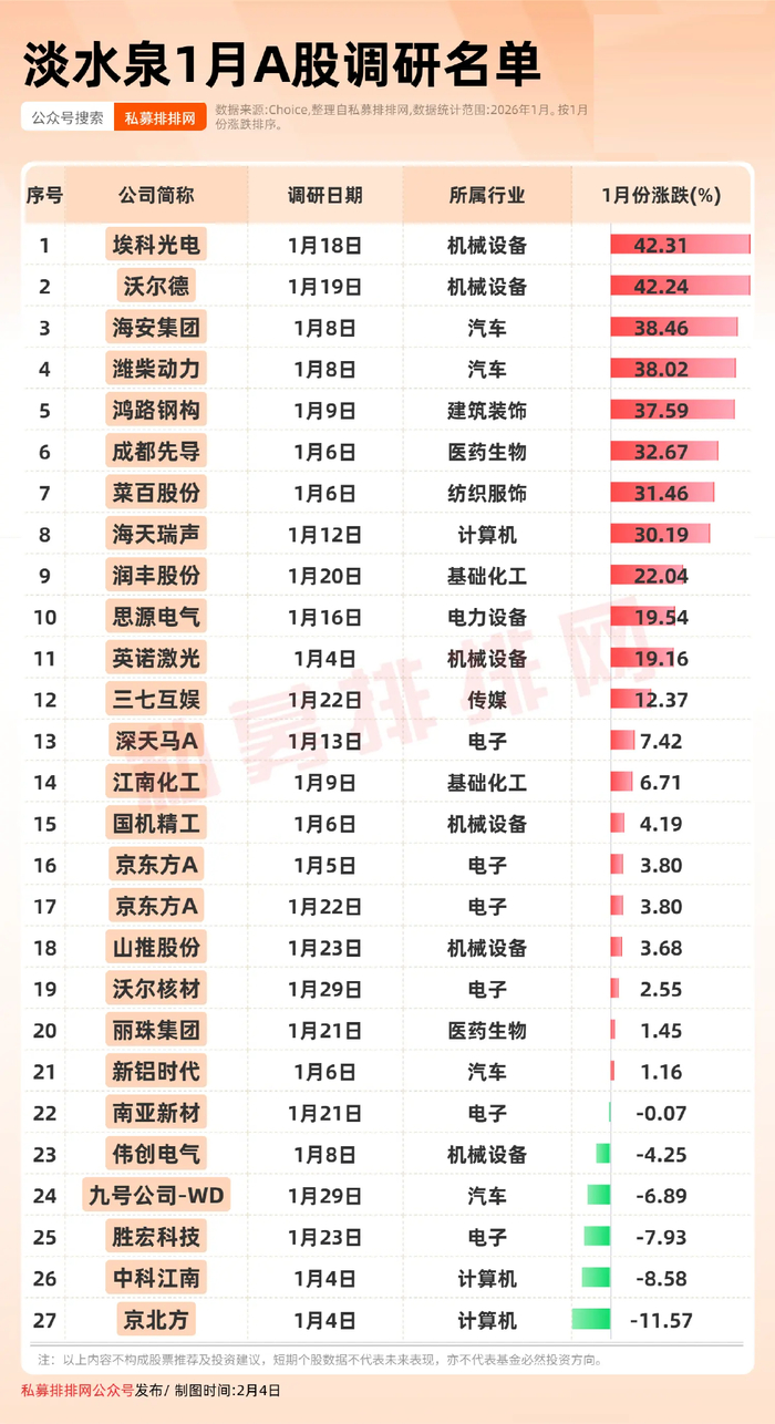淡水泉1月调研最积极!埃科光电、沃尔德、海安集团等被关注!