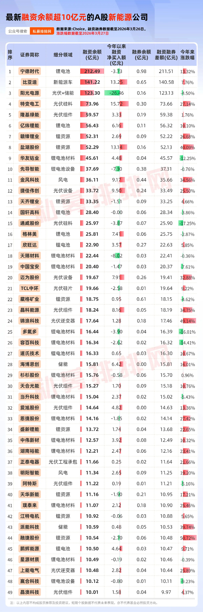 笔者根据Choice数据梳理,截至3月26日,最新融资余额超10亿元的新能源概念股共共有49只,宁德时代、比亚迪、阳光电源的融资余额均超100亿元。赣锋锂业、盛新锂能、融捷股份等8只锂矿股在列。