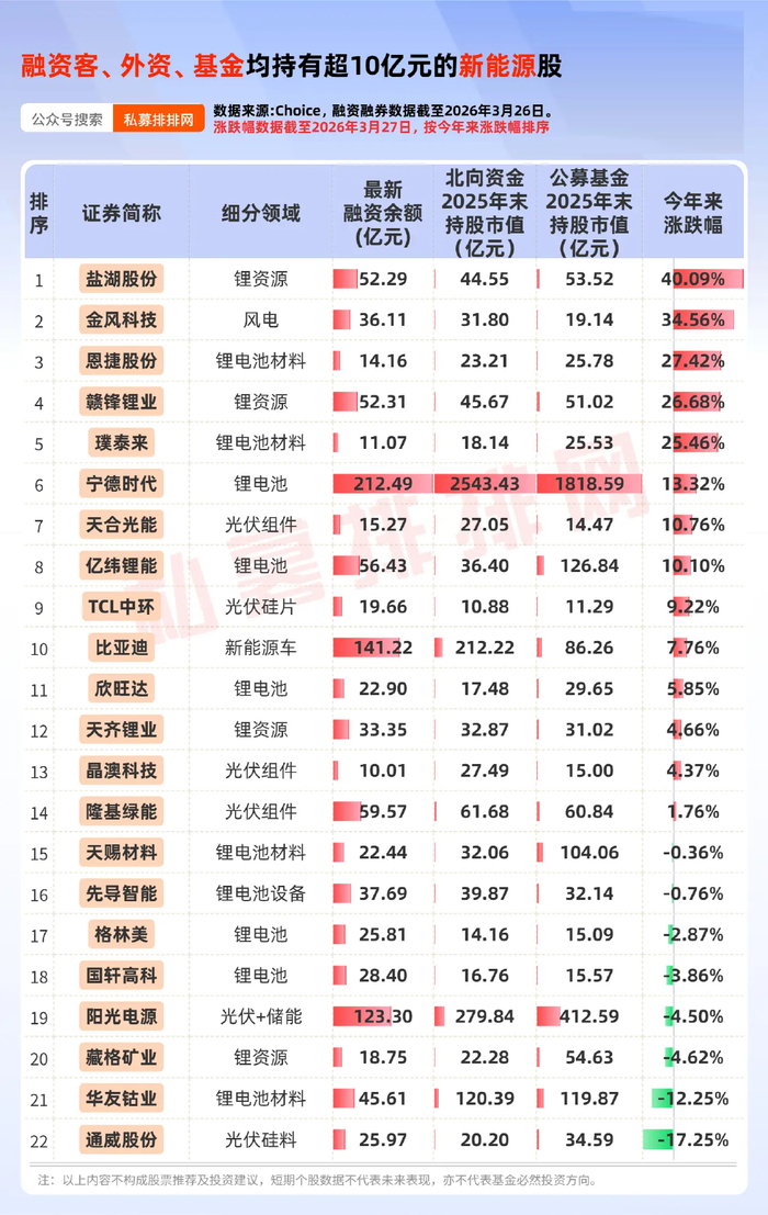 经笔者进一步梳理发现,有22只新能源股被“融资客、公募基金、北向资金(外资)”共同持股均超10亿元,4只锂矿股在列。