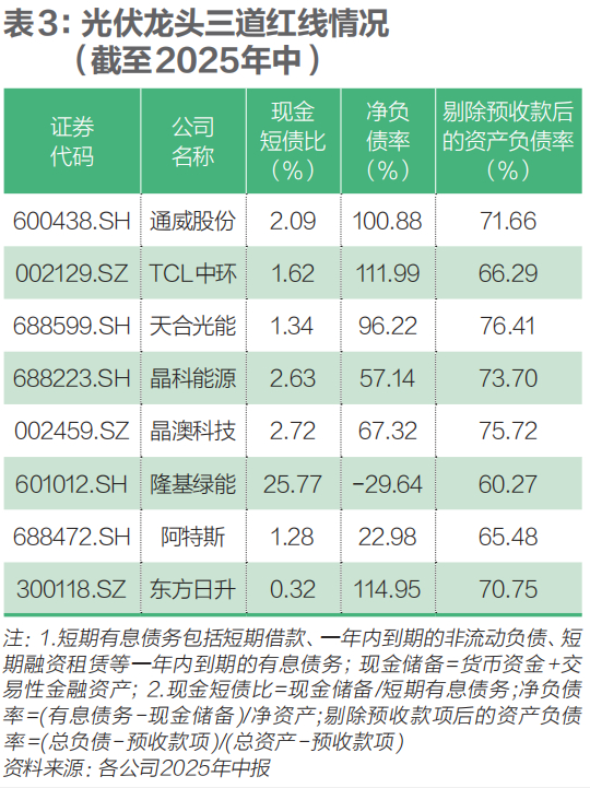 近年来,多数光伏行业龙头企业的资产负债率呈上升趋势,尤其是通威股份与晶澳科技。截至2025年上半年,两家企业剔除预收款后的资产负债率较2022年底分别上升22.36个和17.61个百分点,增幅居前。