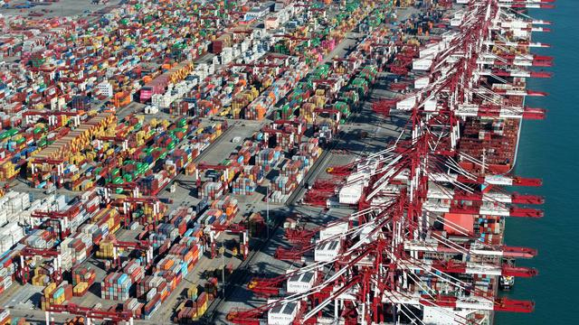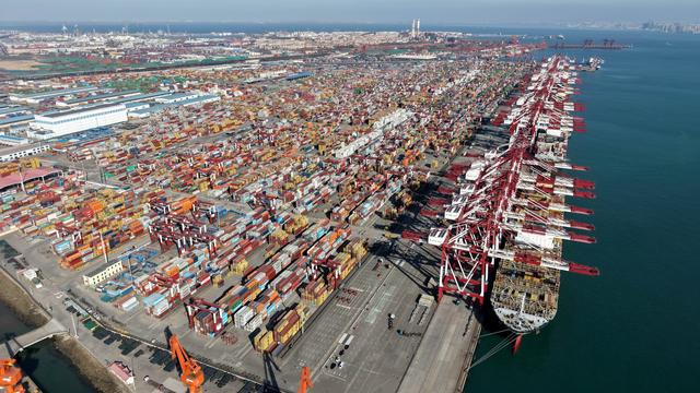 12月8日,集装箱货运卡车在青岛港前湾港区装卸作业。新华社记者 李紫恒 摄