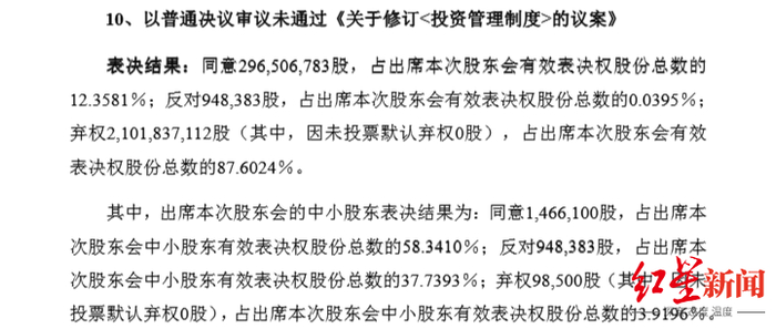 公告显示,上述未审议通过的议案以普通决议进行,同意约2.97亿股,占出席本次股东会有效表决权股份总数的12.3581%;反对94.84万股,占出席本次股东会有效表决权股份总数的0.0395%;弃权约21.02亿股(具体持股数量为2101837112股,其中因未投票默认弃权0股),占出席本次股东会有效表决权股份总数比例87.6024%。