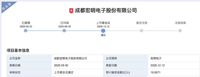 12月12日,深交所官网显示,成都宏明电子股份有限公司(以下简称“宏明电子”)创业板IPO项目获得上市委审议通过,即将进入发行与上市阶段。作为国内电子元件行业的领军者,宏明电子连续承担国家“十三五”和“十四五”重点研发计划,并获得多项国家科技进步奖。