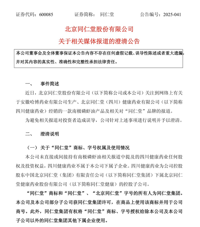 同仁堂称,四川健康药业为公司控股股东中国北京同仁堂(集团)有限责任公司(简称“同仁堂集团”)下属北京同仁堂健康药业股份有限公司(以下简称“同仁堂健康”)的控股子公司。上市公司同仁堂未直接或间接持有南极磷虾油相关报道中提及的四川健康药业任何股权及投资权益,四川健康药业不属于上市公司同仁堂下属子企业。