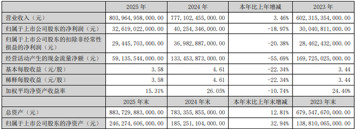 2025年,比亚迪全年累计销量为460.24万辆,同比增长7.73%;营收8039.64亿元,同比增长3.46%;归母净利润326.19亿元,同比下降18.97%;扣非净利润294.46亿元,同比下降20.38%。