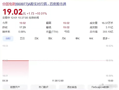 12月1日一早,该片国内发行方中国电影(600977)股价一字涨停。前一交易日,该股午后快速拉升封板。此外,幸福蓝海、博纳影业、光线传媒、横店影视、万达电影等影视院线股均跟涨。