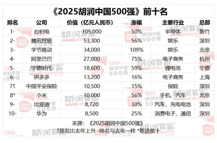 2月5日,胡润研究院发布《2025胡润中国500强》,列出了中国500强非国有企业,按照企业价值进行排名(注:上市公司市值按照2025年11月14日的收盘价计算,非上市公司估值参考同行业上市公司或根据最新一轮融资情况进行估算)。
