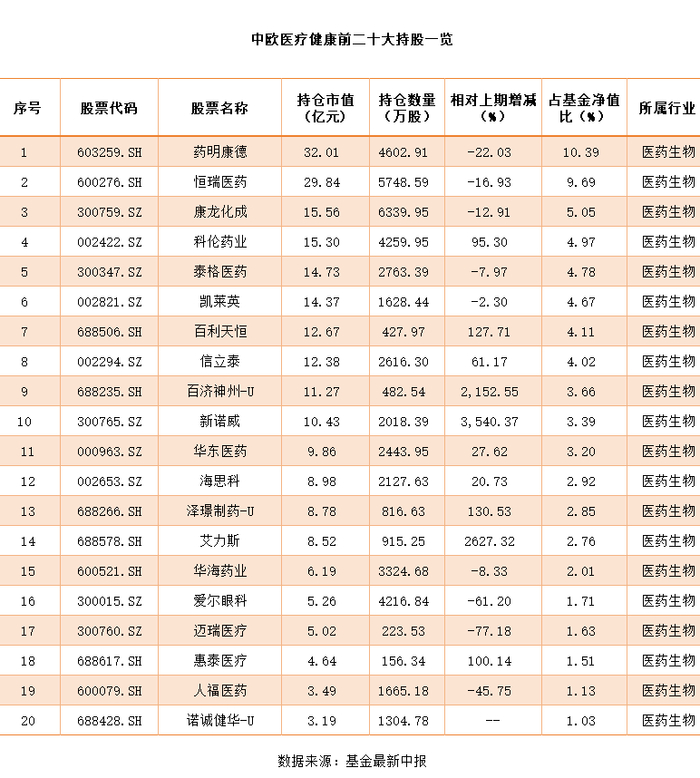 整体来看,中欧医疗健康最新十大隐形重仓股的持股市值占基金净值比均超过1%。前二十大持仓中,创新药个股数量已经提升至11只。其中,艾力斯和百济神州-U在上半年的增持幅度均超过21倍;泽璟制药-U、百利天恒的持仓数量也实现翻倍增长。