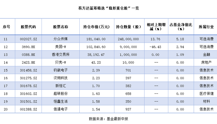 目前,持股市值占基金净值比在1%以上的隐形重仓股有3只,分别是分众传媒(5.18%)、美团-W(2.94%)和香港交易所(1.09%),持股数量分别为2.48亿股、900万股、100万股。