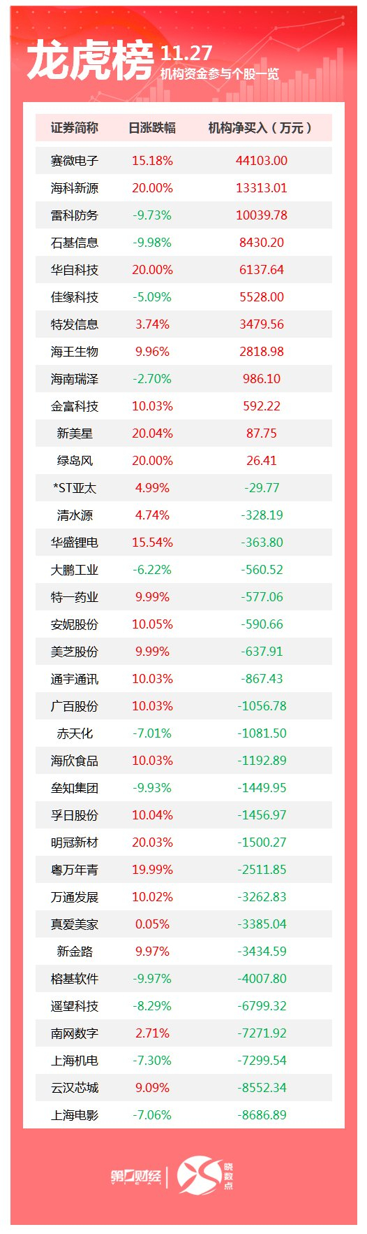 盘后数据显示,11月27日龙虎榜中,共36只个股出现了机构的身影,有12只股票呈现机构净买入,24只股票呈现机构净卖出。