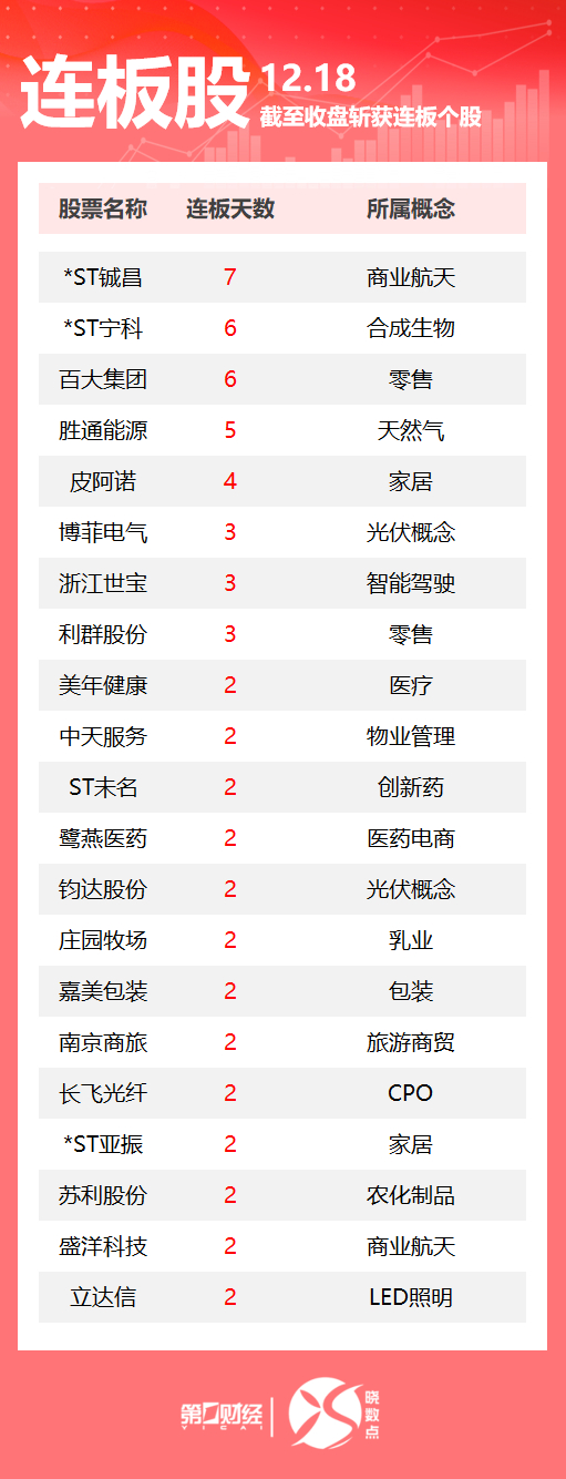 12月18日,Wind数据显示,A股市场共计73只个股涨停。其中商业航天板块*ST铖昌收获7连板,零售板块百大集团6连板、利群股份3连板,智能驾驶板块浙江世宝3连板。一图速览今日连板股>>