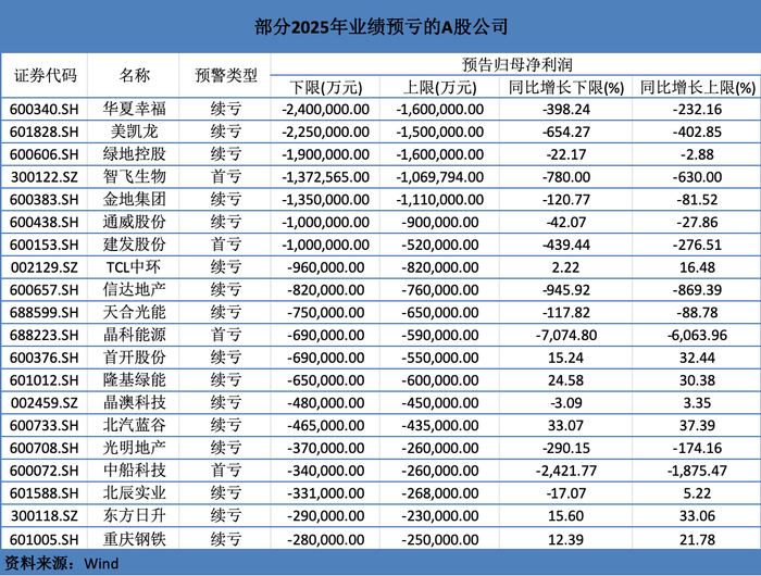 另据Wind统计,截至1月26日,共计1165家A股公司已披露2025年业绩预告,业绩下滑的有709家,占比约六成,当期预计亏损的有500多家。从行业来看,预亏幅度较大的企业扎堆房地产、建筑行业,涉及华夏幸福(600340.SH)、绿地控股(600606.SH)等。华夏幸福预计去年亏损160亿元至240亿元,暂时成为“亏损王”。