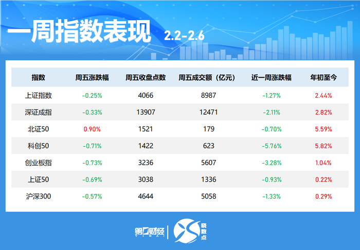 本周(2月2日至6日)三大指数齐跌,沪指累计下跌1.27%,深成指跌2.11%,创业板周跌3.28%。
