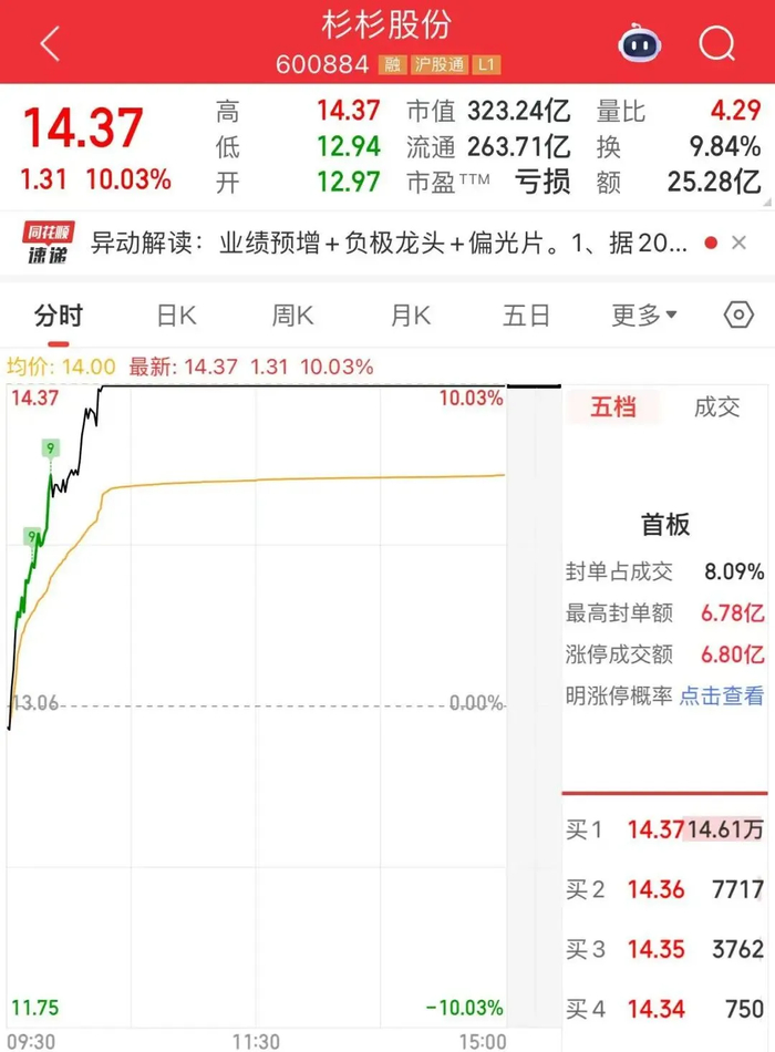 2月6日,杉杉股份放量涨停,截至收盘,涨停板上仍有14.61万手封单,最新市值为323.24亿元。当日,杉杉股份成交额达25.28亿元,换手率9.84%。2月9日,杉杉股份开盘涨停,截至收盘报15.81元/股。