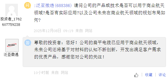 泛亚微透 [688386] :公司的扁平电缆已应用于商业航天领域,未来公司还将基于对材料的认知不断创新,开发出满足客户需求的优质产品。