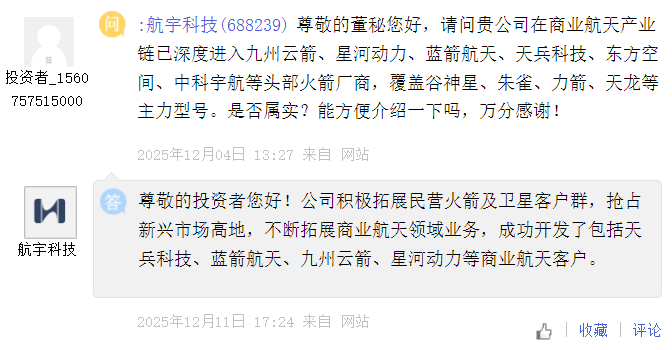 上述因素在资本市场共同催生了强烈的乐观预期,投资者看好商业航天从技术验证迈向规模化、商业化应用的巨大潜力,尽管许多公司当前盈利能力尚未体现,但市场更愿意为未来的成长空间“买单”。国内商业航天上市企业的业务发展有哪些进展?全景为您精选来自上市公司最真实的声音。(以下内容均摘自深交所互动易、上证e互动、上市公司公告等)