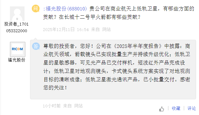 福光股份 [688010] :公司在《2025年半年度报告》中披露:商业航天领域,箭载镜头已实现批量生产并持续升级优化;低轨卫星的星敏感器,可见光产品已交付样机,短波红外产品完成设计;低轨卫星对地观测镜头,卡式镜头系统方案实现了对地观测目标的清晰成像;低轨卫星激光通讯产品,已小批量交付。