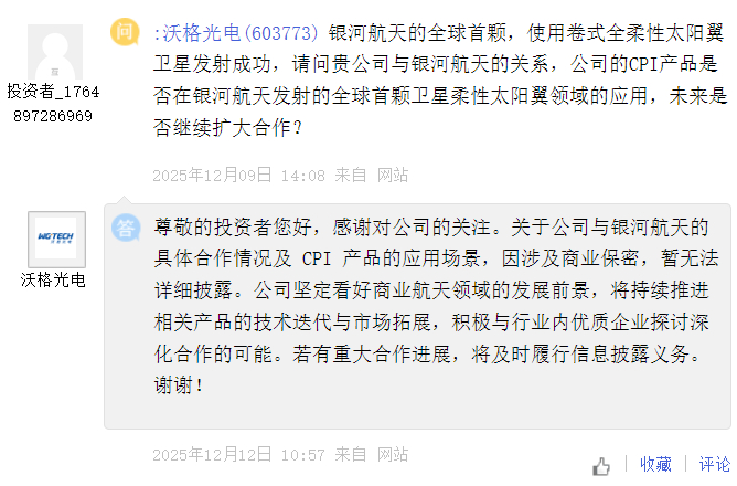 沃格光电 [603773] :2026年CPI产品出口情况受全球商业航天市场需求、行业竞争格局、政策环境等多重因素影响,目前暂无法准确预计出口是否会大幅增长。国内商业航天领域,公司已与部分企业建立业务合作或洽谈对接,具体客户信息因保密要求不便披露。后续公司将积极推进商业航天领域的市场拓展,相关业务进展请以公司公告为准。