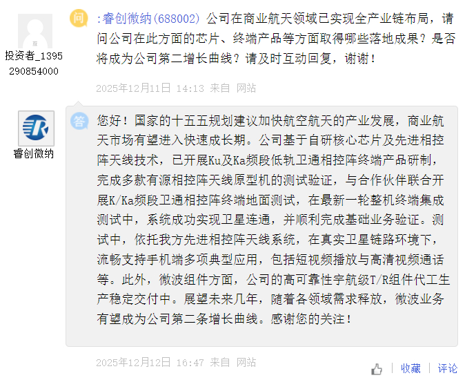 睿创微纳 [688002] :国家的十五五规划建议加快航空航天的产业发展,商业航天市场有望进入快速成长期。公司基于自研核心芯片及先进相控阵天线技术,已开展Ku及Ka频段低轨卫通相控阵终端产品研制,完成多款有源相控阵天线原型机的测试验证,与合作伙伴联合开展K/Ka频段卫通相控阵终端地面测试,在最新一轮整机终端集成测试中,系统成功实现卫星连通,并顺利完成基础业务验证。测试中,依托我方先进相控阵天线系统,在真实卫星链路环境下,流畅支持手机端多项典型应用,包括短视频播放与高清视频通话等。此外,微波组件方面,公司的高可靠性宇航级T/R组件代工生产稳定交付中。展望未来几年,随着各领域需求释放,微波业务有望成为公司第二条增长曲线。