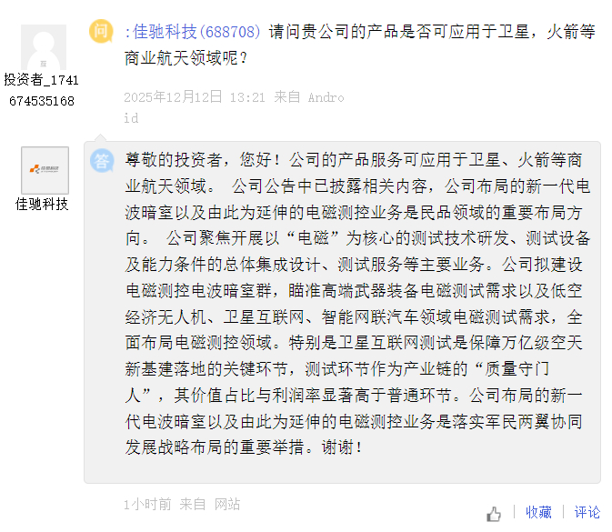 佳驰科技 [688708] :公司的产品服务可应用于卫星、火箭等商业航天领域。公司公告中已披露相关内容,公司布局的新一代电波暗室以及由此为延伸的电磁测控业务是民品领域的重要布局方向。公司聚焦开展以“电磁”为核心的测试技术研发、测试设备及能力条件的总体集成设计、测试服务等主要业务。公司拟建设电磁测控电波暗室群,瞄准高端武器装备电磁测试需求以及低空经济无人机、卫星互联网、智能网联汽车领域电磁测试需求,全面布局电磁测控领域。特别是卫星互联网测试是保障万亿级空天新基建落地的关键环节,测试环节作为产业链的“质量守门人”,其价值占比与利润率显著高于普通环节。公司布局的新一代电波暗室以及由此为延伸的电磁测控业务是落实军民两翼协同发展战略布局的重要举措。