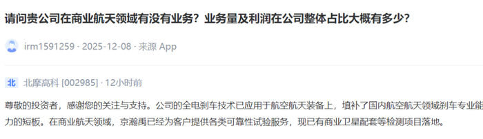 北摩高科 [002985] :公司的全电刹车技术已应用于航空航天装备上,填补了国内航空航天领域刹车专业能力的短板。在商业航天领域,京瀚禹已经为客户提供各类可靠性试验服务,现已有商业卫星配套等检测项目落地。