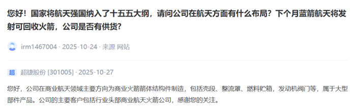 超捷股份 [301005] :公司在商业航天领域主要方向为商业火箭箭体结构件制造,包括壳段、整流罩、燃料贮箱,发动机阀门等,属于大型部件产品。公司的主要客户包括行业头部商业航天火箭公司。