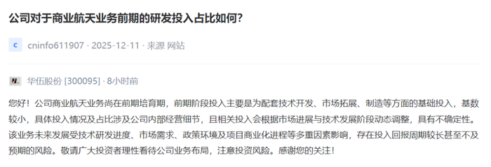 华伍股份 [300095] :公司商业航天业务尚在前期培育期,前期阶段投入主要是为配套技术开发、市场拓展、制造等方面的基础投入,基数较小,具体投入情况及占比涉及公司内部经营细节,且相关投入会根据市场进展与技术发展阶段动态调整,具有不确定性。该业务未来发展受技术研发进度、市场需求、政策环境及项目商业化进程等多重因素影响,存在投入回报周期较长甚至不及预期的风险。敬请广大投资者理性看待公司业务布局,注意投资风险。