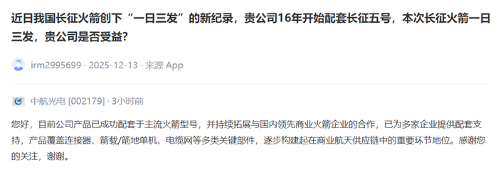 中航光电 [002179] :目前公司产品已成功配套于主流火箭型号,并持续拓展与国内领先商业火箭企业的合作,已为多家企业提供配套支持,产品覆盖连接器、箭载/箭地单机、电缆网等多类关键部件,逐步构建起在商业航天供应链中的重要环节地位。