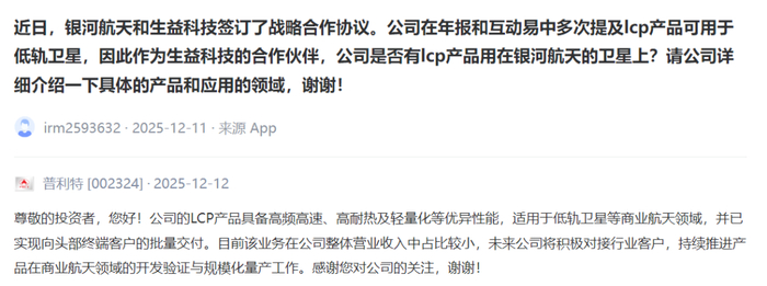 普利特 [002324] :公司的LCP产品具备高频高速、高耐热及轻量化等优异性能,适用于低轨卫星等商业航天领域,并已实现向头部终端客户的批量交付。目前该业务在公司整体营业收入中占比较小,未来公司将积极对接行业客户,持续推进产品在商业航天领域的开发验证与规模化量产工作。