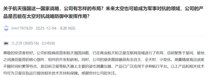 久之洋 [300516] :公司积极响应国家航天强国战略,已在商业航天和卫星互联网领域进行了布局,目前聚焦于星间、星地之间通信载荷的核心部件、组件的开发和研制。同时,公司的星体跟踪器具有全自主、全天时、小型化、测量精度高且误差不随时间积累等特点,是目前卫星等航天器上主要的姿态测量仪器,产品已广泛应用于多种航行平台。以上产品和相关技术均可为卫星在轨运行提供相关技术支持和保障。