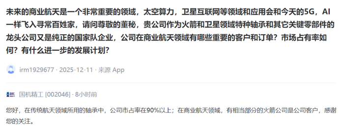 国机精工 [002046] :在传统航天领域所用的轴承中,公司市占率在90%以上;在商业航天领域,有相当部分的火箭公司是公司客户。
