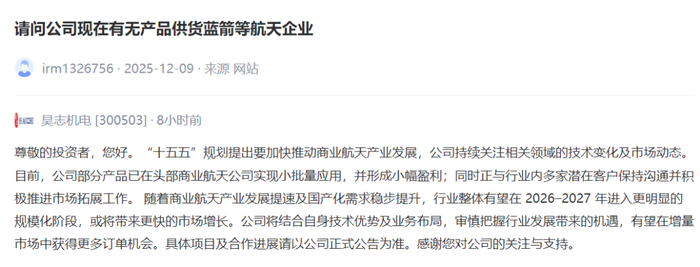 昊志机电 [300503] :“十五五”规划提出要加快推动商业航天产业发展,公司持续关注相关领域的技术变化及市场动态。目前,公司部分产品已在头部商业航天公司实现小批量应用,并形成小幅盈利;同时正与行业内多家潜在客户保持沟通并积极推进市场拓展工作。 随着商业航天产业发展提速及国产化需求稳步提升,行业整体有望在2026-2027年进入更明显的规模化阶段,或将带来更快的市场增长。公司将结合自身技术优势及业务布局,审慎把握行业发展带来的机遇,有望在增量市场中获得更多订单机会。