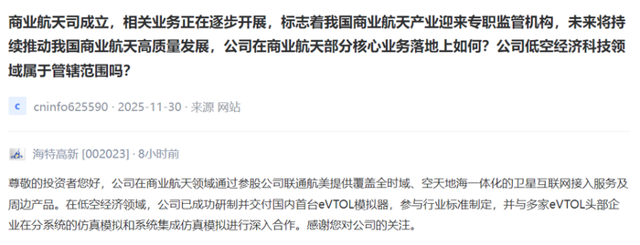 海特高新 [002023] :公司在商业航天领域通过参股公司联通航美提供覆盖全时域、空天地海一体化的卫星互联网接入服务及周边产品。在低空经济领域,公司已成功研制并交付国内首台eVTOL模拟器,参与行业标准制定,并与多家eVTOL头部企业在分系统的仿真模拟和系统集成仿真模拟进行深入合作。