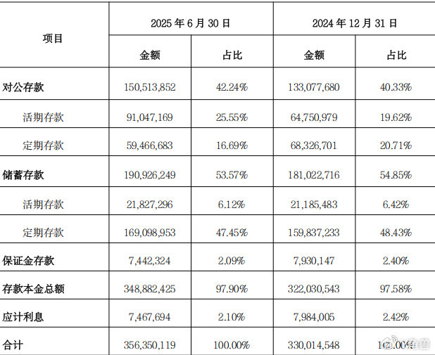 利率较低的对公存款大幅增长,是促成存款利率大幅下降的一个重要因素。半年报披露,仅半年时间,活期对公存款的增幅就达到了惊人的40%以上。相比之下,定期对公存款的余额,较2024年年末下降了14.9%。